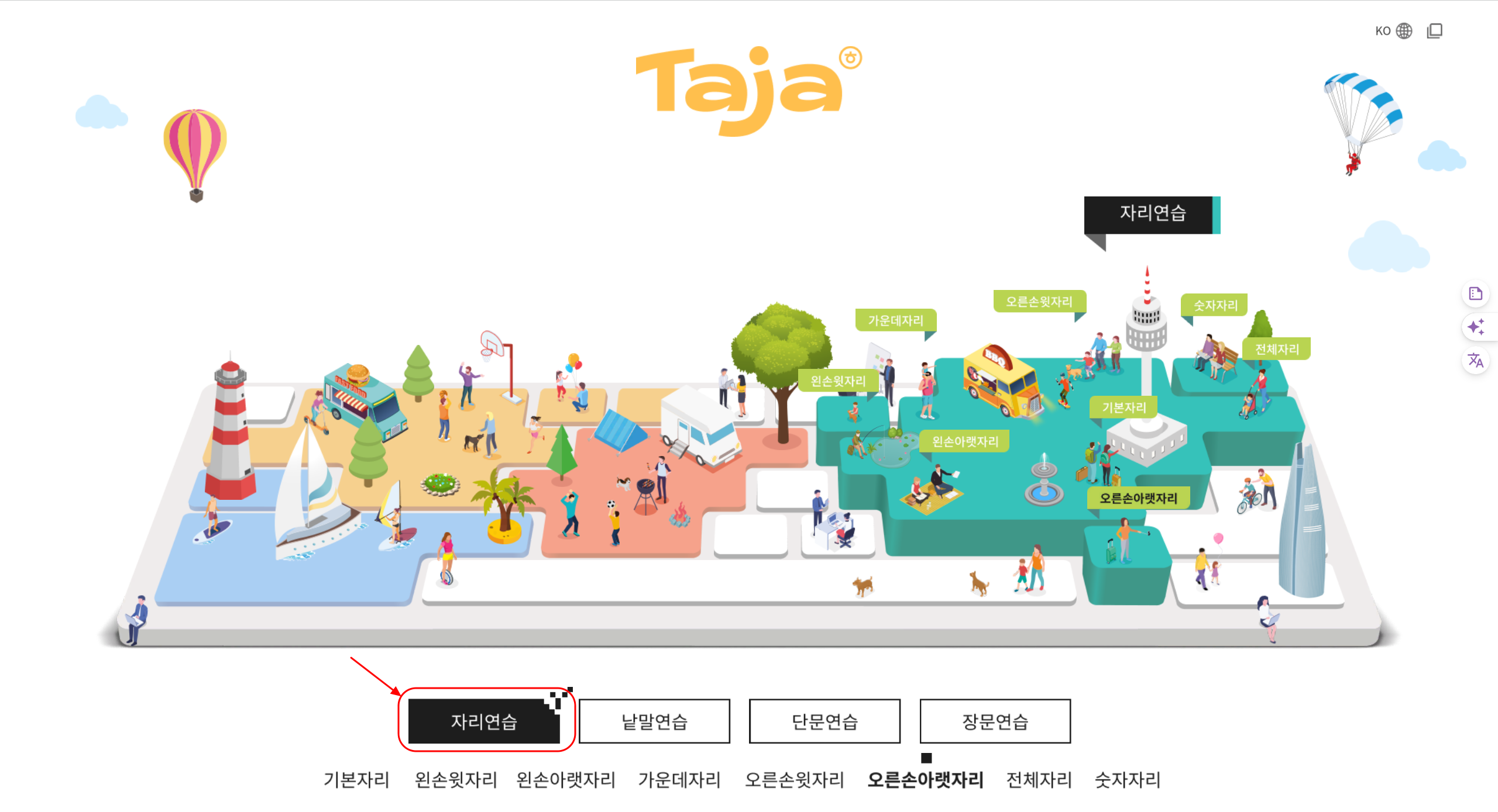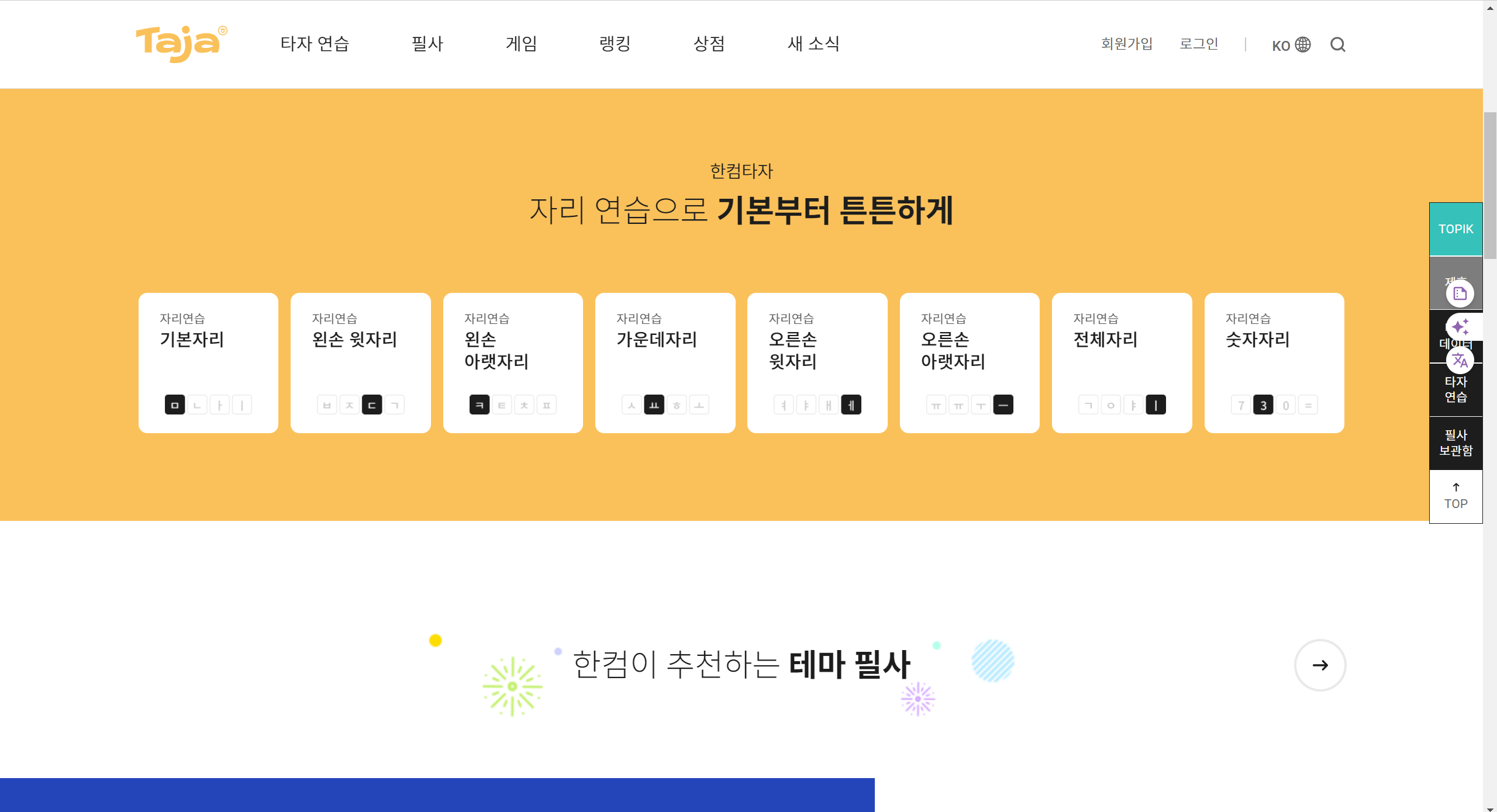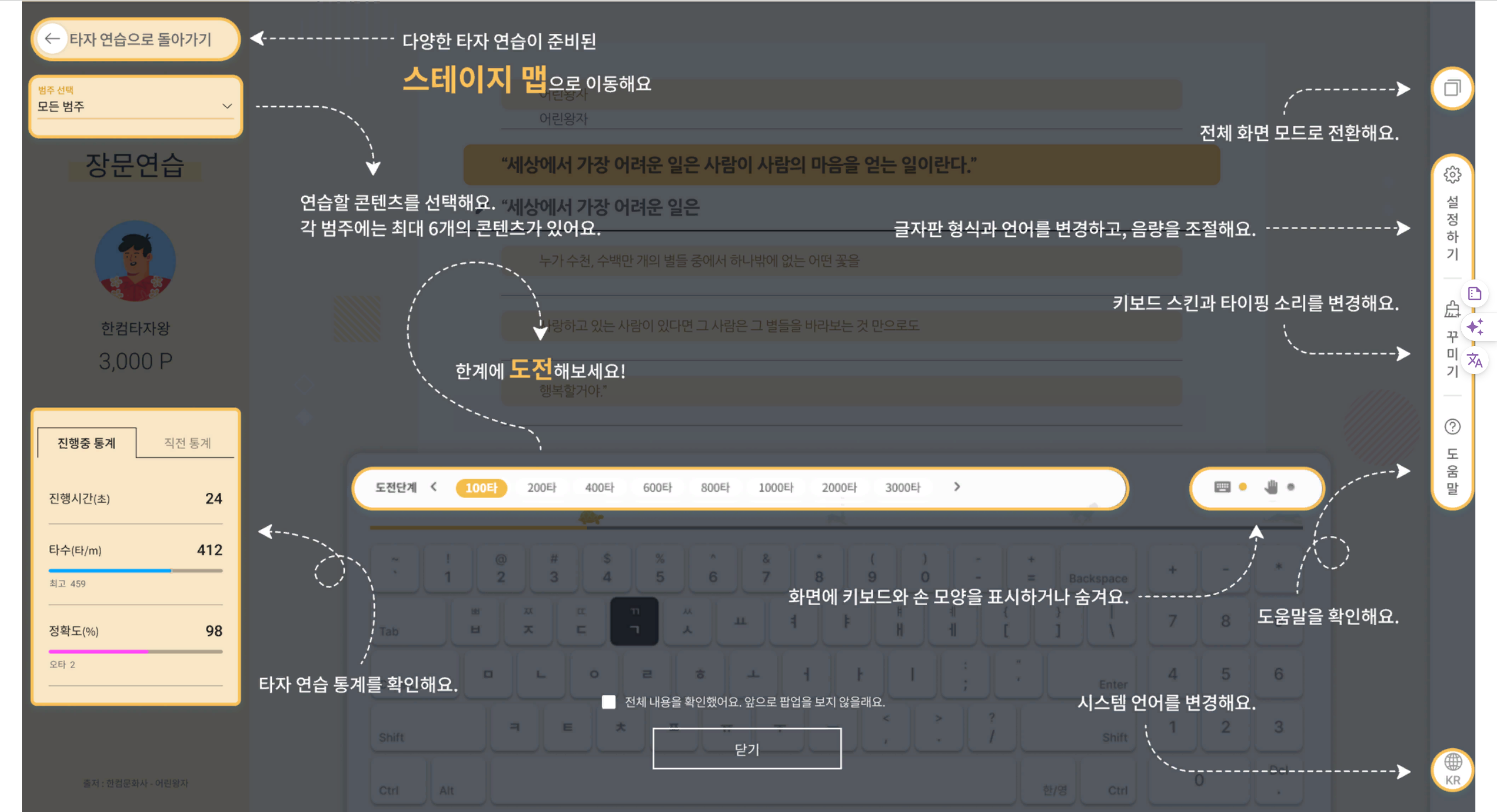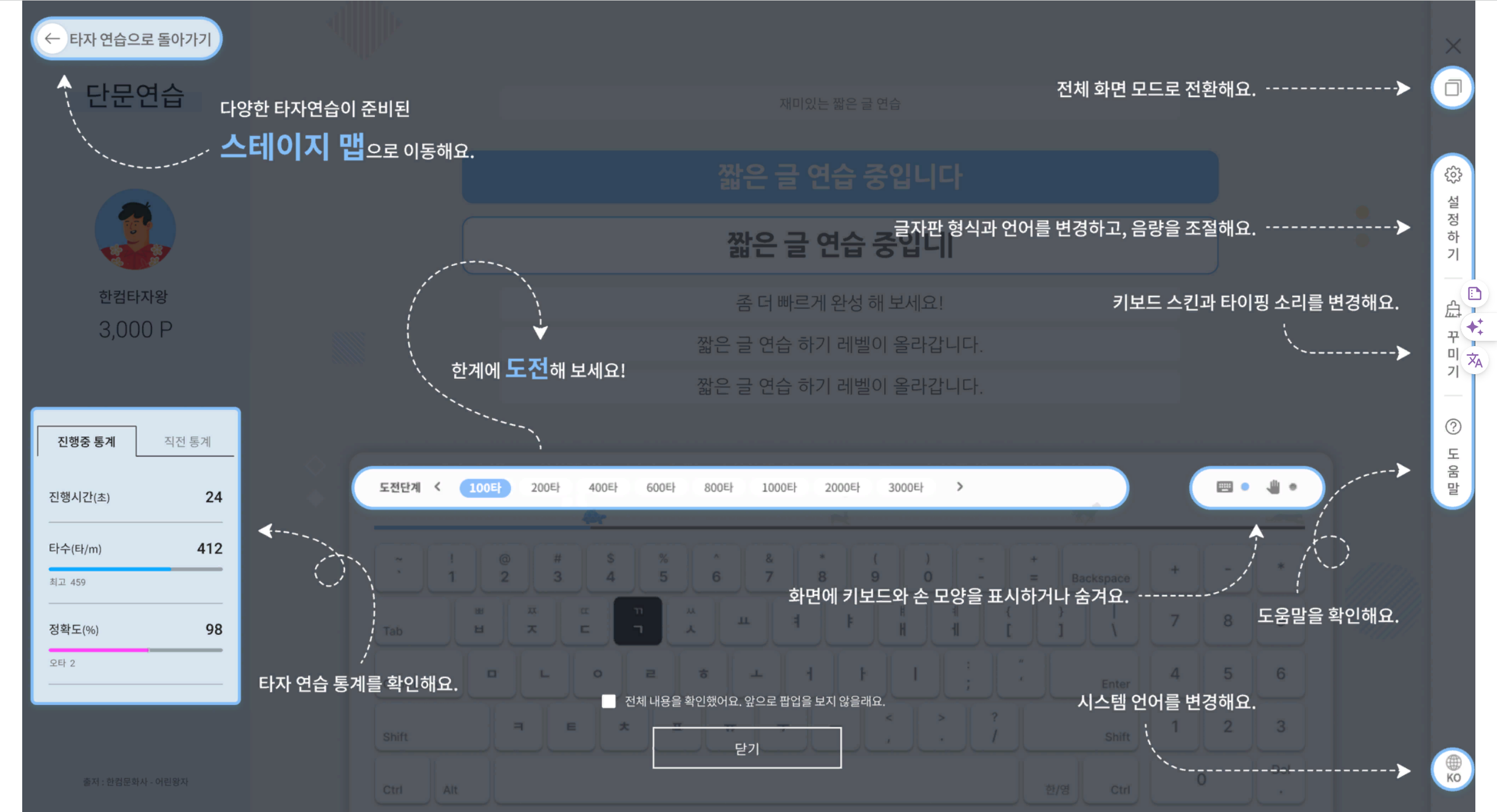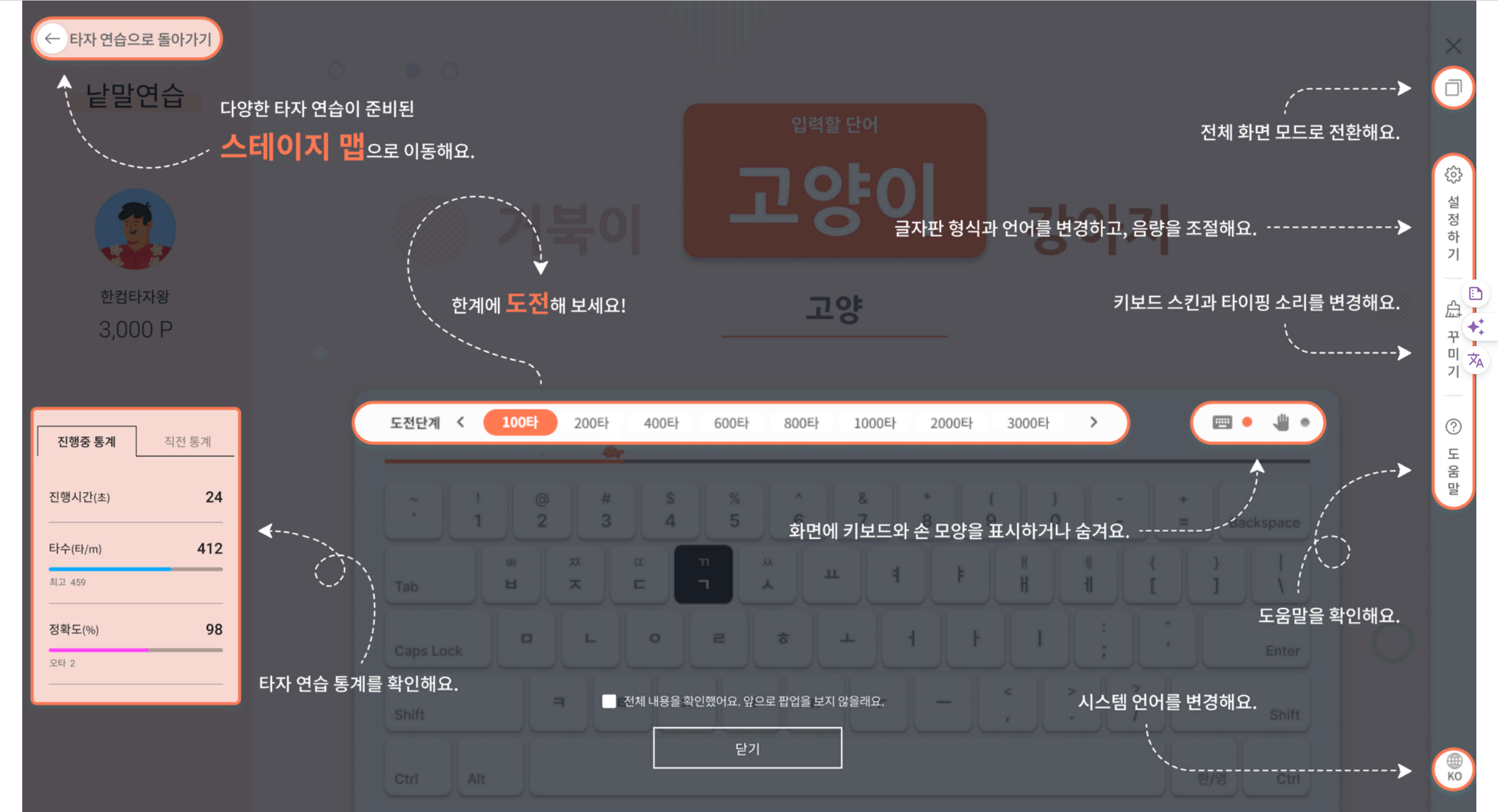 한글 자판 익히기에 최적화된 연습 모드로, 키보드 그림이 위치를 알려주며, 초보자들이 따라 하며 익히기에 적합한 인터페이스를 제공합니다.
