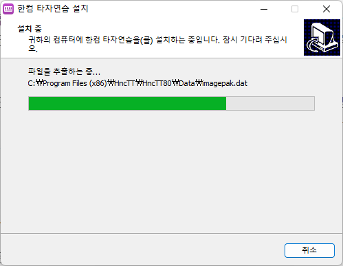 3️⃣ 자동 설치 진행 설치 경로를 지정할 수 없지만, 자동으로 설치가 진행됩니다. 설치가 완료되면 바탕화면에 보라색 한컴 타자연습 아이콘이 생성됩니다.
