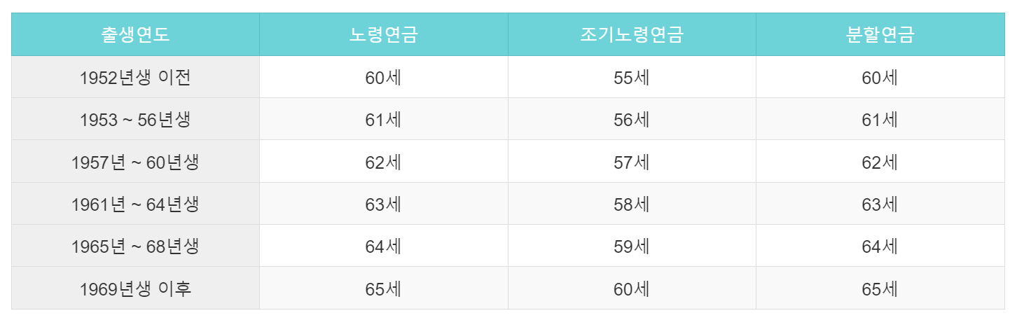 국민연금은 출생연도에 따라 수령할 수 있는 나이가 다릅니다. 아래 표를 통해 자신의 수령 나이를 확인해보세요.