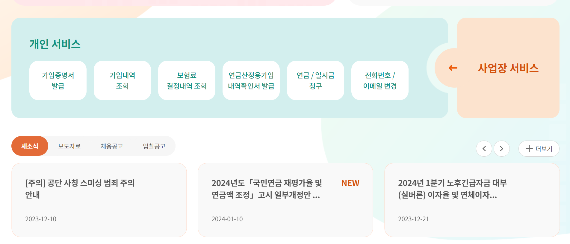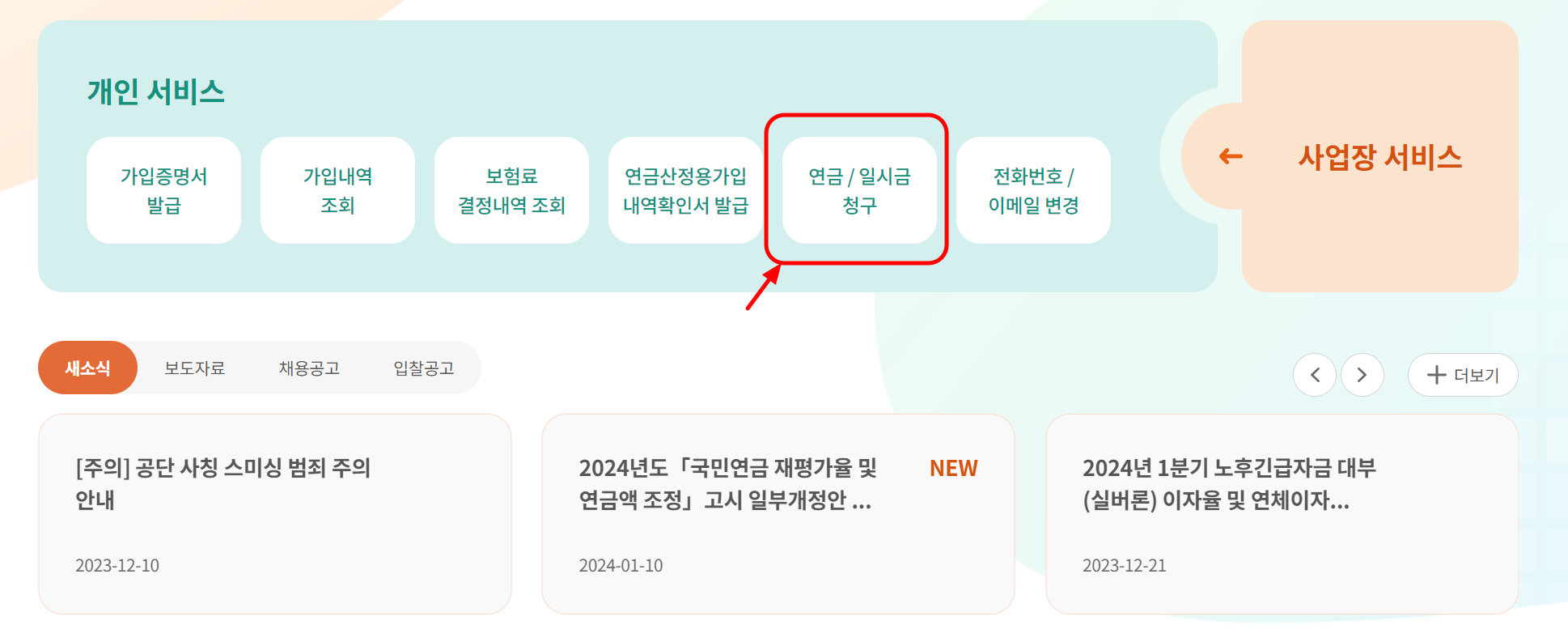 🔹홈페이지 접속: 검색 결과 중 빨간 박스로 표시된 국민연금공단 공식 홈페이지에 접속합니다.