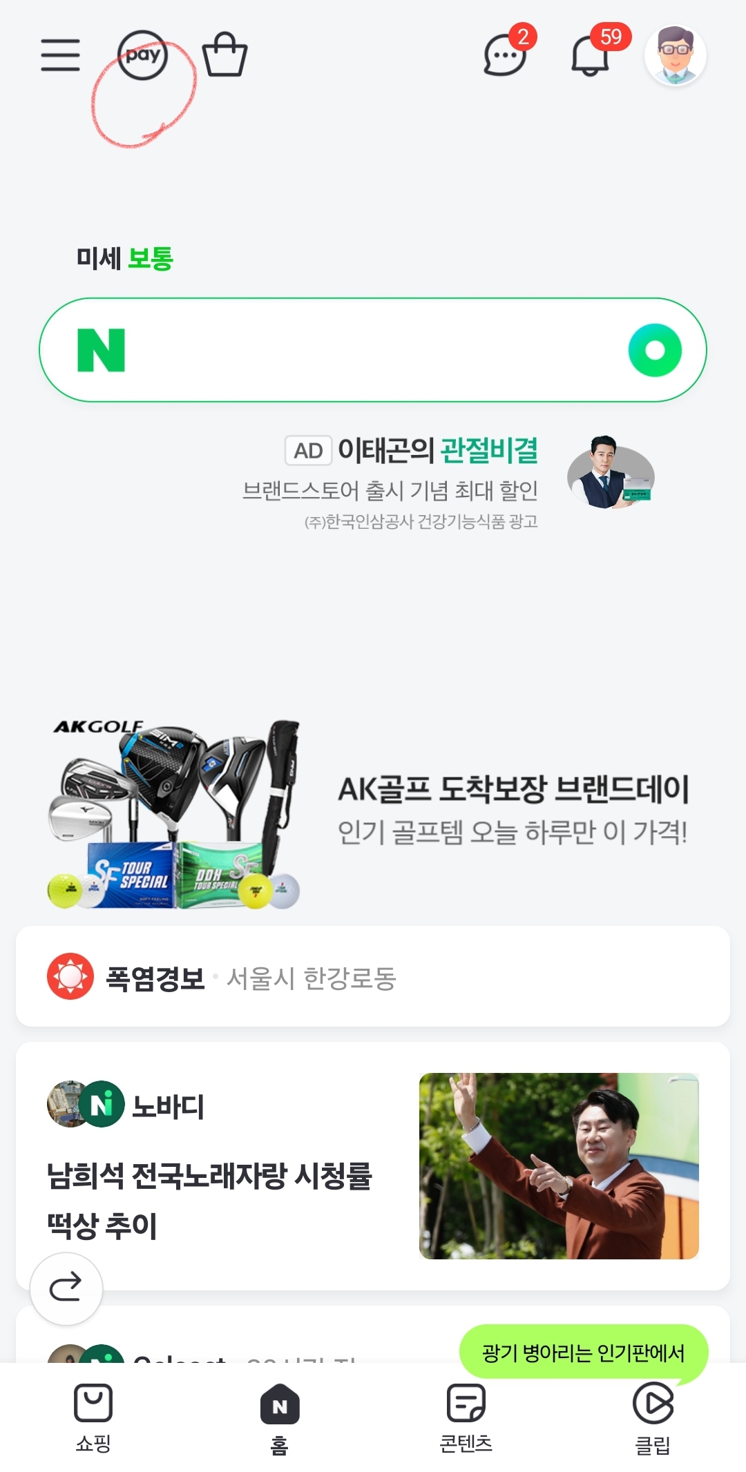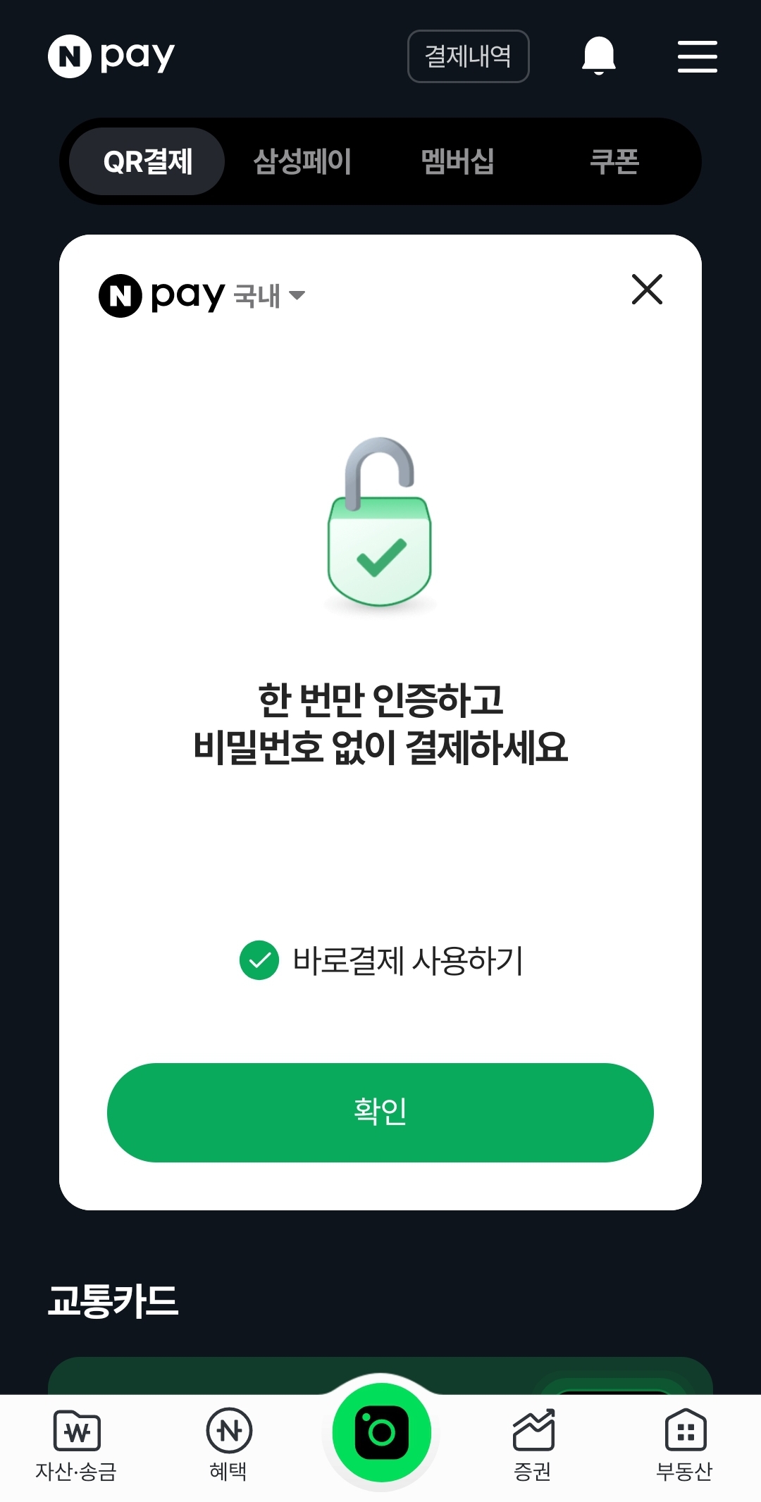 🔹네이버 앱에서 상단 우측의 ‘Pay’ 아이콘을 눌러 결제 페이지로 들어가면, QR코드가 생성됩니다.