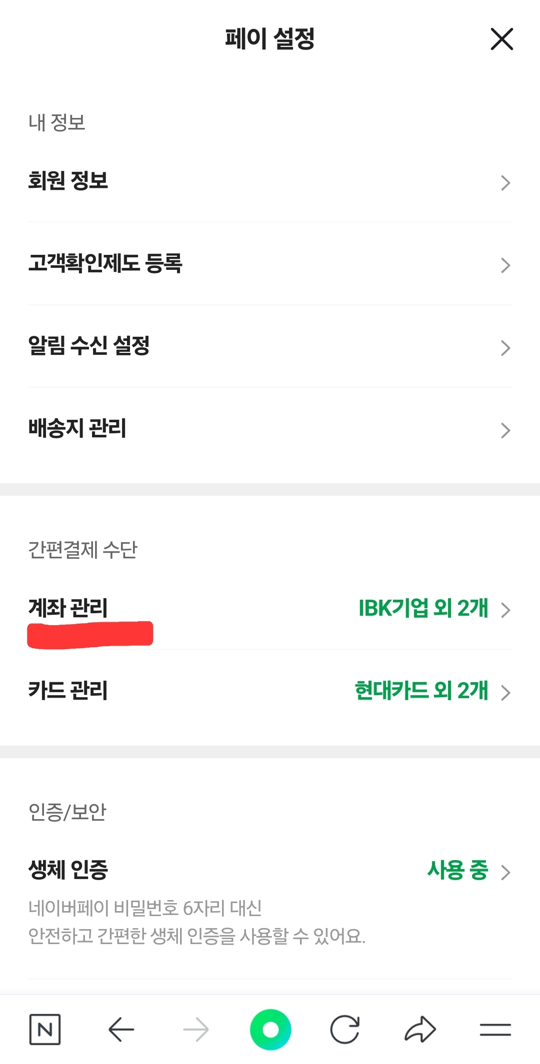 여기에서 [계좌 관리]를 선택하여 본인의 은행 계좌를 등록할 수 있습니다. 간단한 본인 인증 절차를 거치면 네이버페이에 계좌 연결이 완료됩니다.